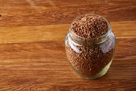 Buckwheat groats in a small glass jar on wooden background, close-up, selective focus. Studio shot. Some copy space for your inscription or text. Nutritious organic protein. Vegan cuisine. Healthy eating, dieting. Healthy food concept.