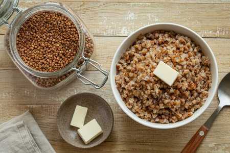 buckwheat porridge with butter in white bowl, wooden background. top view
