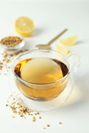 Concept of hot drink with buckwheat tea on white background