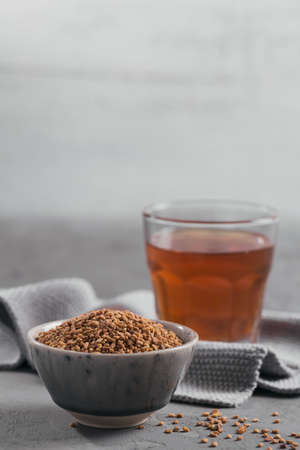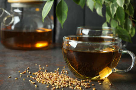 Concept of hot drink with buckwheat tea on dark textured table