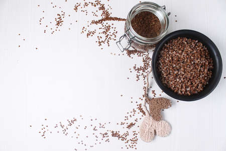 Buckwheat in a glass jar on a wooden white table. Copy, empty space for text.