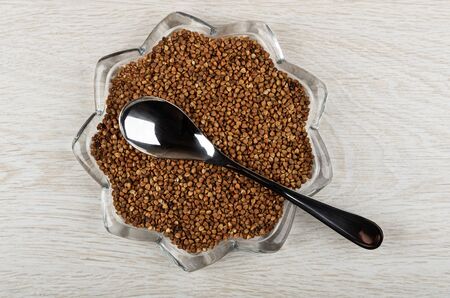 Dry roasted buckwheat, metallic spoon in transparent plate in form star on wooden table. Top view
