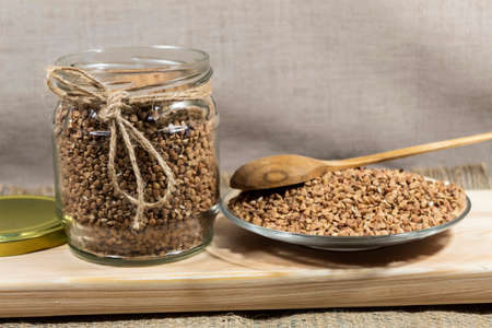 In a transparent jar and on a plate there are buckwheat grains. A wooden spoon lies on top.