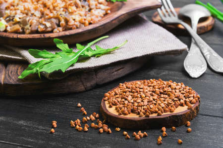 Buckwheat cereal with roasted mushrooms in a wooden plate, raw buckwheat to cereal, asparagus, pot pottery, silver fork and spoon, green lettuce leaves on a dark black background wooden surface