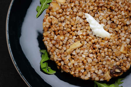 Buckwheat porridge with butter and herbs on a plate, on a dark background