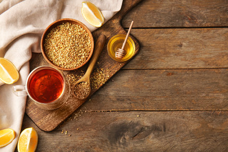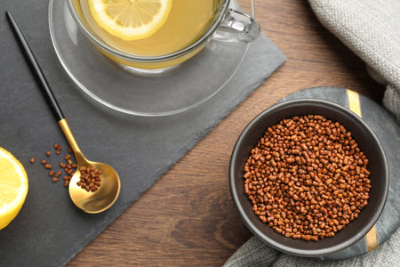 Cup of freshly made aromatic buckwheat tea and granules on wooden table, flat lay