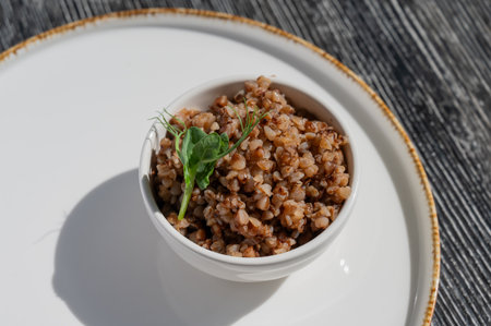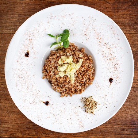 Restaurant food. Food, benefit, health concept. buckwheat with cheese and herbs