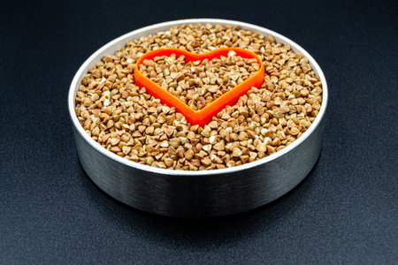 raw buckwheat in a small white plate and a heart of buckwheat on a yellow background copy space