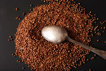 Raw buckwheat groats in a heap on a black background. Scattered buckwheat in a spoon on a dark background