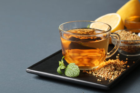 Glass cup of hot buckwheat tea with mint leaves on gray background