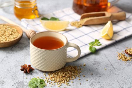 Cup of hot buckwheat tea with mint leaves and star anise on gray grunge background