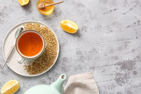 Concept of hot drink with buckwheat tea on light textured table