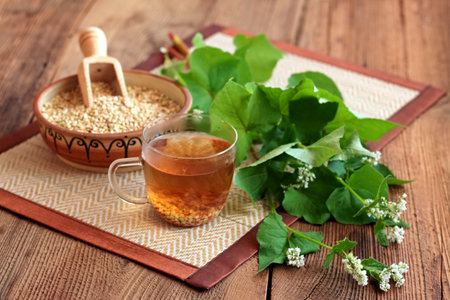 Herbal tea made from buckwheat seed, lat. Fagopyrum esculentum, fresh flowering plant next to it. The whole plant is full of rutin good against varicose veins.