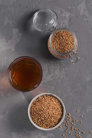 Bowl of fenugreek seeds and Egyptian fenugreek yellow tea or Methi Dana drink on gray background