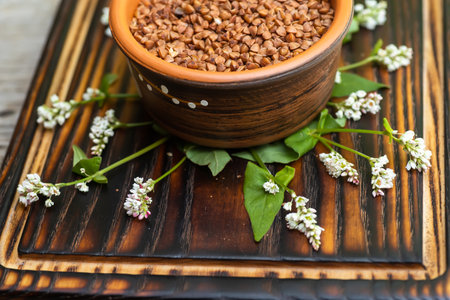 buckwheat in clay plate on table. Fresh buckwheat flowers. Healthy Food Concept