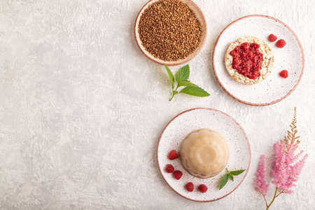 Buckwheat milk jelly on gray concrete background. top view, flat lay, copy space.