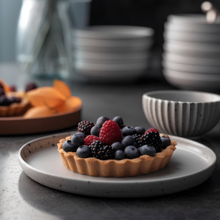 Fresh fruit tart on a plate with assorted berries in natural light