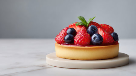 A vibrant fruit tart adorned with fresh strawberries and blueberries, resting on a marble surface and illuminated by soft light, perfect for summer desserts and culinary delights.