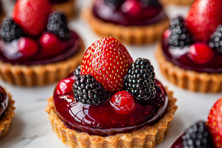 A vibrant display of assorted blackberry tarts showcases a rich, glossy fruit glaze topped with plump strawberries and blackberries. This sweet treat invites indulgence at any gathering.