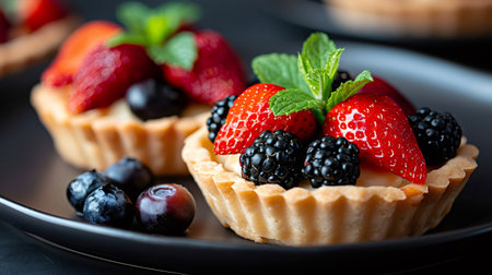 Colorful fruit tarts filled with creamy pastry cream are topped with fresh strawberries, blackberries, and blueberries. Green mint leaves add a touch of freshness to each tart.
