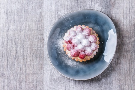 Tartlet with custard, fresh raspberries and sugar powder, served on gray ceramic plate over white wooden surface. With copy space at left. Top view