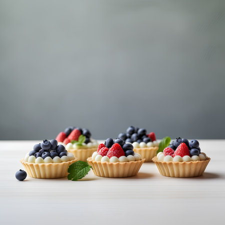 Colorful berry tarts featuring raspberries and blueberries on a creamy filling, beautifully arranged with green basil leaves, perfect for a sweet treat or a special event.