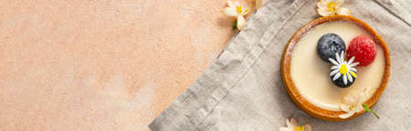 cream dessert, cake, with fresh berries. sweet tartlet on a pink background, banner
