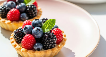 Assorted berry tartlets with fresh mint on a light pink plate