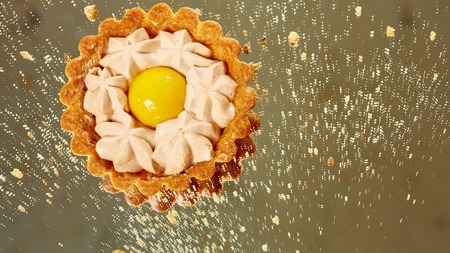Close up view - delicious fresh shortcrust tart cake with yellow cream for sale on counter of shop, grocery, market, cafe or bakery. Dessert, sweet food and confectionery concept