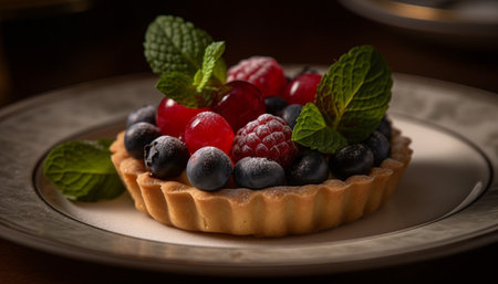 Fresh berry tart with mint leaf decoration generated by artificial intelligence