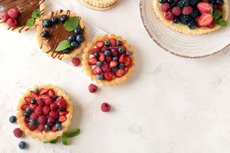 Assortment of fruit tartlets with berries, top view