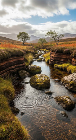 Landscape image of a small creek flowing through a valley in the Scottish Highlands