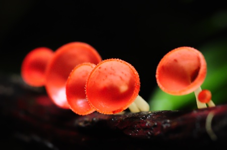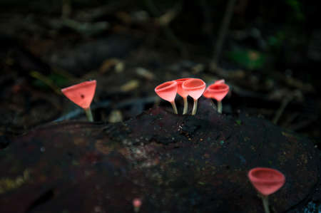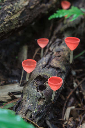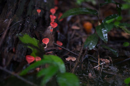 Red mushrooms shaped like glass of champagne or Cookeina speciosa are found a lot at Chaloem Rattanakosin National Park, Kanchanaburi, Thailand.