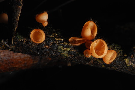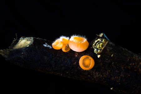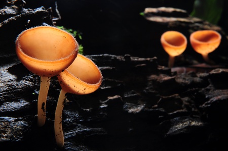 Mushrooms orange fungi cup (Cookeina sulcipes (Berk.) Kuntze.) on decay wood, in the rain forest.