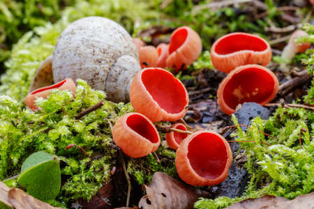 Close-up macro photo of red Scarlet elfcup (Sarcoscypha austriaca) mushrooms and a snail shell on the mossy ground in the spring forest.