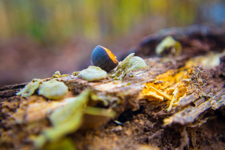 Mushrooms orange fungi cup Cookeina sulcipes on decay wood, . Flora, champagne.
