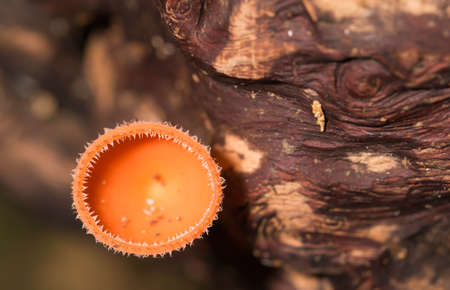 Mushrooms orange fungi cup ( Cookeina sulcipes ) on decay wood, in the rain forest.
