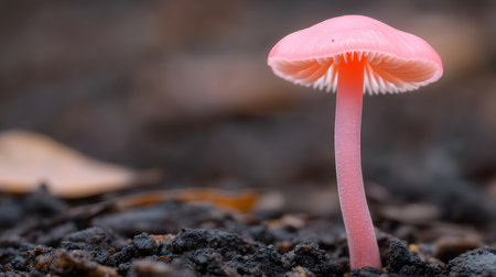 A slender pink mushroom stands alone in the damp earth, its delicate form captured in soft focus. The muted tones create a serene and ethereal atmosphere.