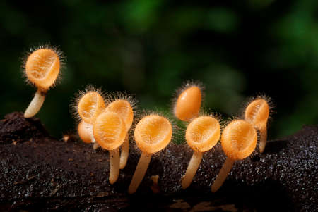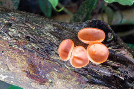 Champagne mushroom on decay wood in the rain forest. Cookeina sulcipes