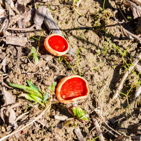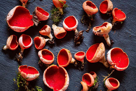 Beautiful macro shot of edible spring mushrooms scarlet elf cup