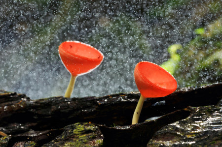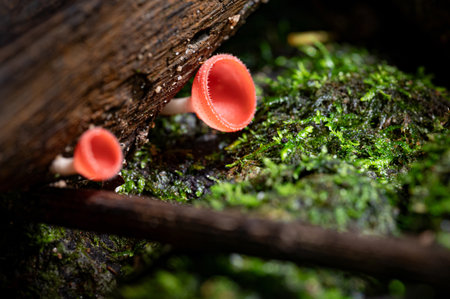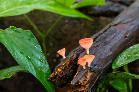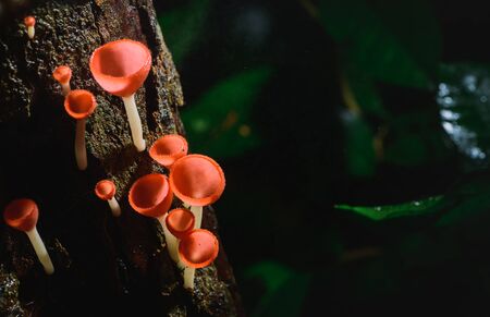 Champagne mushrooms have a beautiful red or orange cup shape in the rainforest,botanical environment fungus toadstool growing,concept:Plants for vegetarian food for health