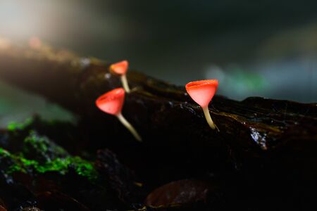 Beautiful red champagne mushroom growing on decayed tree in rain forest during rainy season in national park of Thailand