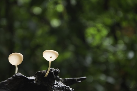 closeup of forest mushrooms(Champagne cup)in the waterfall