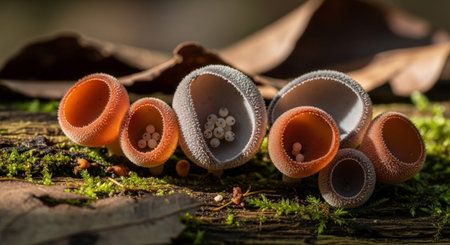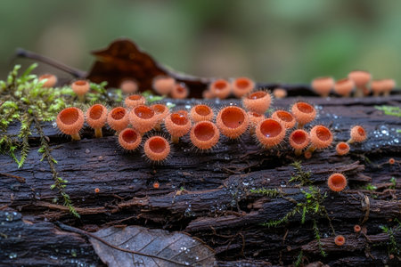 Orange fungi cups flourish near a water source, their delicate forms glistening with mist. Like forest lanterns, they add vibrant color to the lush, damp habitat, glowing amid moss and cascading waters.