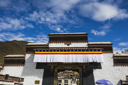 Front view of Tashi Lhunpo (Tashilhunpo) Monastery in courtyard on summer sunny day with blue sky and cloud, Thanka wall in background, Shigatse, Tibet, China