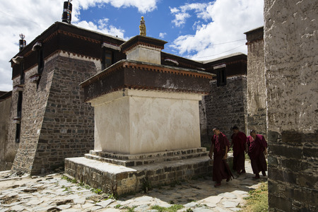 LHASA, TIBET, CHINA - AUGUST, 17 2018: Tibetan monks in the Ganden Monastery located at the top of Wangbur Mountain, Lhasa Tibet