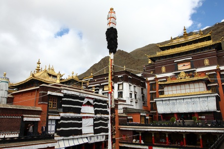Big prayer flag pole at the eastern entrance to the South Seat of Sakya-Grey Soil monastery. Dhvajas and buddhist-chinese flags on rooftop. Sakya-Shigatse prefecture-Tibet.