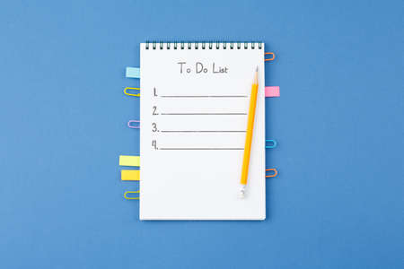 school notebook on a blue background, spiral notepad on a table, to do list