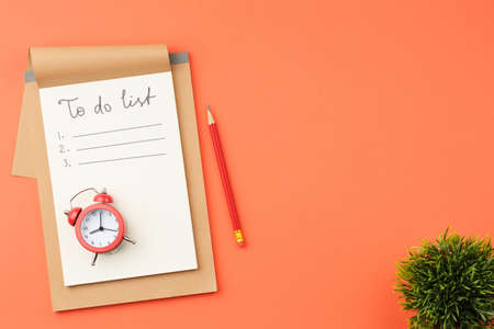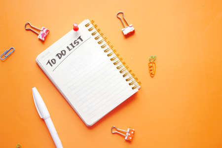 To do list in notebook with office suppliers on orange background .