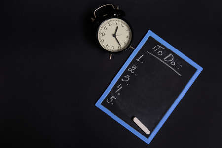 Top view of a chalk board with lettering list to do, with empty copy space and a vintage alarm clock. Isolated on black background. Planning concepts, time management, timetable and timing.
